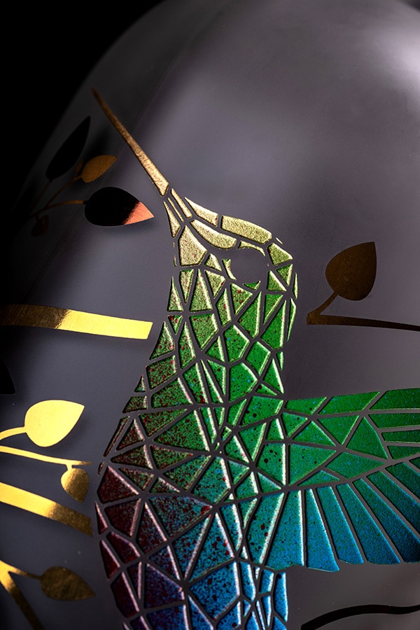 Three-color engraving on satin-finished bottle: The art of the hummingbird in glass and crystal engraving.